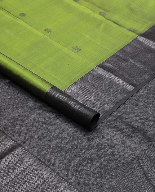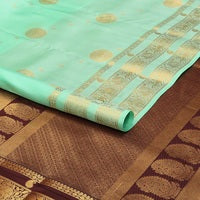 White floral buttas kancheepuram silk saree with contrast ganga jamuna, korvai border of thilakam mokku, poo chakram, mayil design & zari design pallu