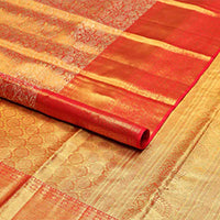 Red pichwai buttas kancheepuram silk saree with contrast korvai intricate zari design border & floral, pichwai zari design pallu