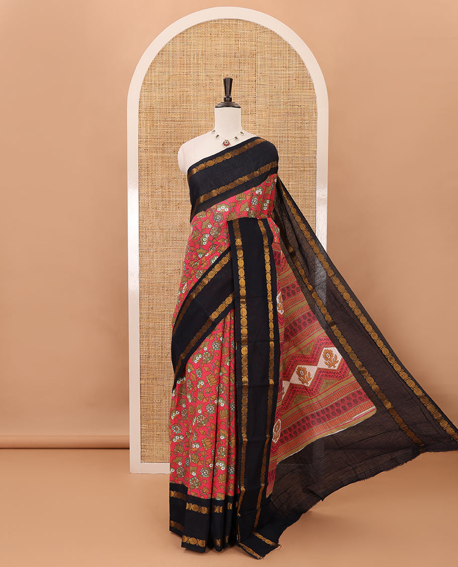 Red floral motifs printed mul mul cotton saree, contrast floral vine printed border, and pallu of floral print