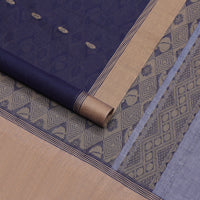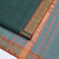 Blue zari buttas Coimbatore cotton saree, zari piping border, and pallu of Mughal style peacock designs Blue zari buttas Coimbatore cotton saree, zari piping border, and pallu of Mughal style peacock designs