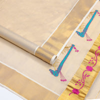 Cream multi-color polka dots printed Kerala tissue cotton saree, zari bavanji border, polka dots printed pallu, and small dots printed blouse Cream multi-color polka dots printed Kerala tissue cotton saree, zari bavanji border, polka dots printed pallu, and small dots printed blouse