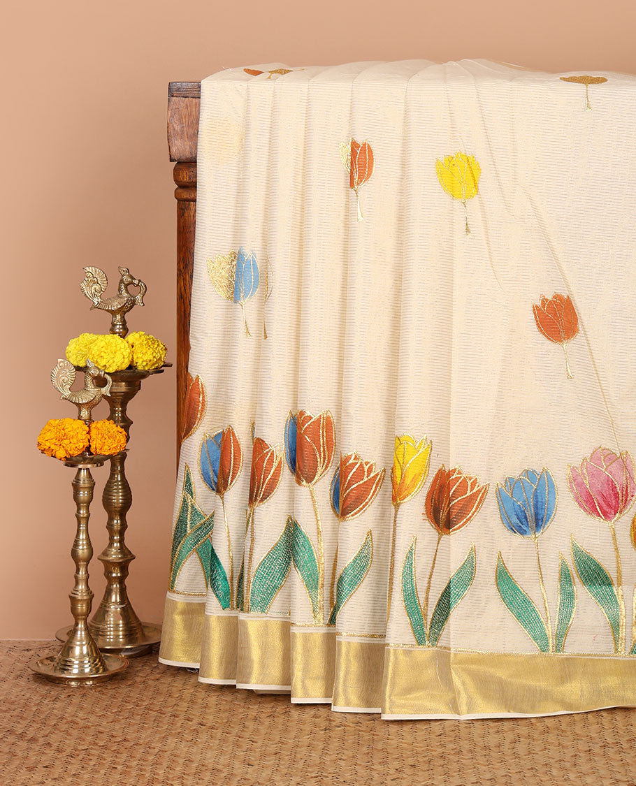 Cream geometric patterned Coimbatore cotton saree, contrast thread border, and pallu of floral designs