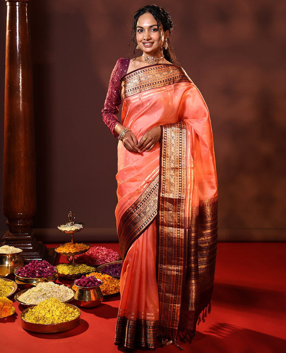 Peach Vasundhara Silk Saree Featuring Floral Zari Buttas and Skrit-Border-Style Contrast Annam Chakram Butta Enclosed Checked Border, Majestically Zari Detailed Pallu, and Paired with a Contrast Blouse