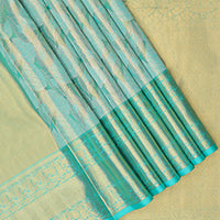 Blue zari design Kanchipuram silk saree, zari border, and pallu of thazampoo rekku, mayil chakram, and jaal design