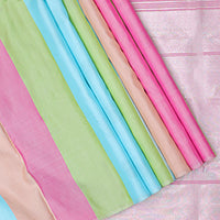 Borderless green-pink half-and-half Kanchipuram silk saree features floral meena buttas, and ara maadam design, contrast traditional motifs zari woven pallu Borderless green-pink half-and-half Kanchipuram silk saree features floral meena buttas, and ara maadam design, contrast traditional motifs zari woven pallu