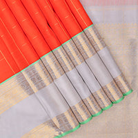 Orange zari buttas and checked Kanchipuram silk saree,contrast border of thilakam,banaras and mayil designs, and jaal pallu Orange zari buttas and checked Kanchipuram silk saree,contrast border of thilakam,banaras and mayil designs, and jaal pallu