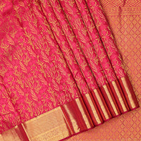 Pink zari woven Kanchipuram silk saree, contrast rettai mayil zari border, and jaal pallu