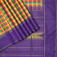 Multi-color paalum pazhamum checked Kanchipuram silk saree, contrast border of manga mokku,neli,mayil kann,kathir, rudraksham, and mayil, and zari pallu Multi-color paalum pazhamum checked Kanchipuram silk saree, contrast border of manga mokku,neli,mayil kann,kathir, rudraksham, and mayil, and zari pallu