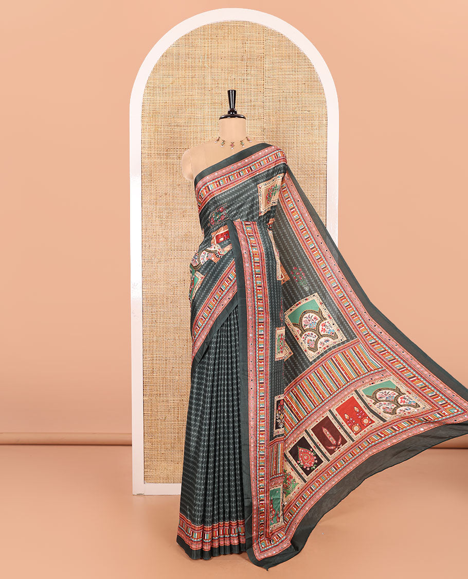 Black deer, crane, and floral motifs digital printed katan silk saree, printed border, floral-animal motifs printed pallu, and a digital printed blouse Black deer, crane, and floral motifs digital printed katan silk saree, printed border, floral-animal motifs printed pallu, and a digital printed blouse