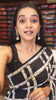 Black checked batik printed mul cotton saree, contrast kaleidoscope colored batik printed pallu, and a contrast batik printed blouse