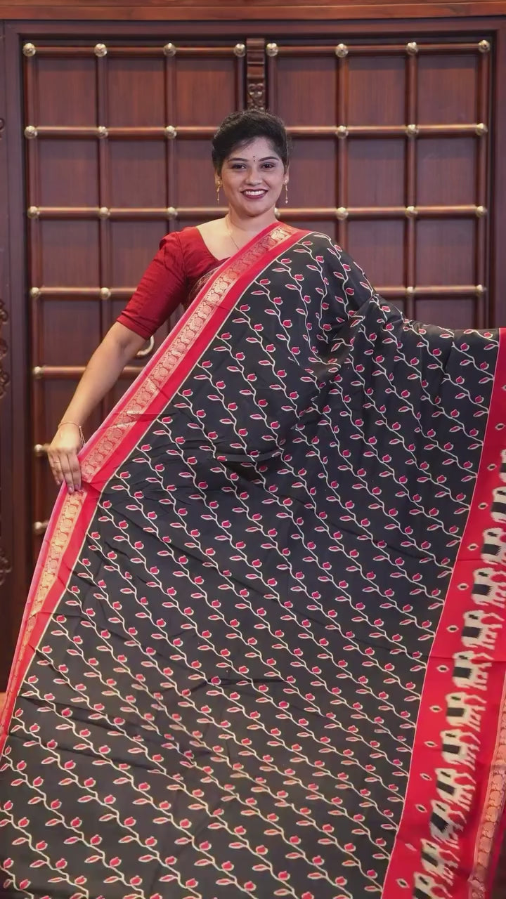 Black floral vine printed Assam cotton saree,contrast border of ikat elephant print & zari peacocks,ikat jaal pallu & ikat print blouse