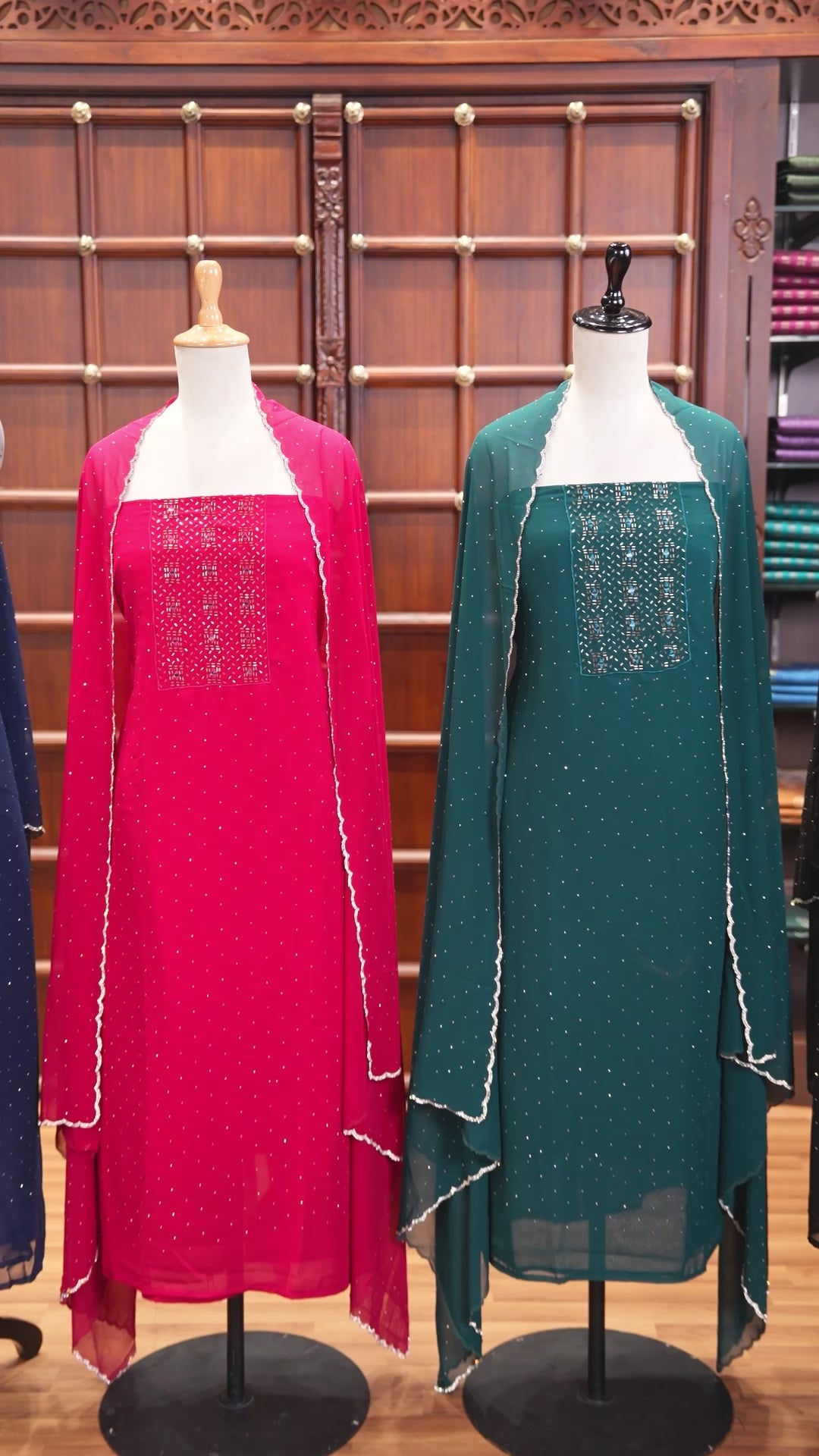 Black material chudidar set, silver stone embroidered with neck bead work georgette top, santoon plain botom, and scallop swarovski stone work dupatta