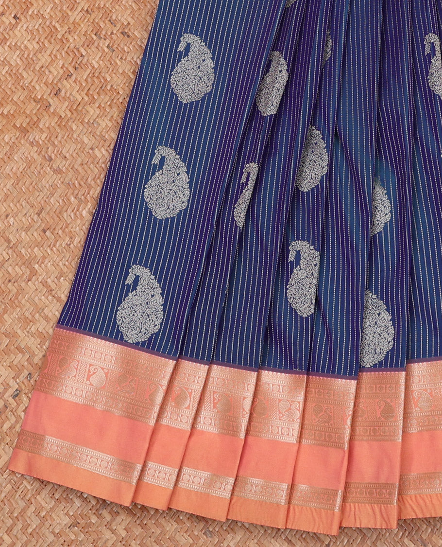 Blue Budget Silk Saree Gleamed Up with Paisley Buttas and Stripes All Over Its Body, Complemented by a Contrast Rettai Pettu Border of Traditional Zari Designs, a Grand Pallu of Jaal Designs, and Paired with a Contrast Blouse Budget Silk Sarees