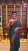 Blue maze geometric-patterned semi-mysore silk saree, contrast rettai pettu traditional zari border, intricate pallu, and a contrast geometric-patterned zari-bordered blouse