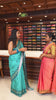 Blue peacock feathers motifs printed katan silk saree, peacock feathers printed border, contrast Radha Krishna stories printed pallu, and contrast printed blouse