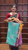 Borderless rama blue floral motifs steeped elite soft silk saree, contrast lotus-like motifs pallu, and contrast buttas blouse