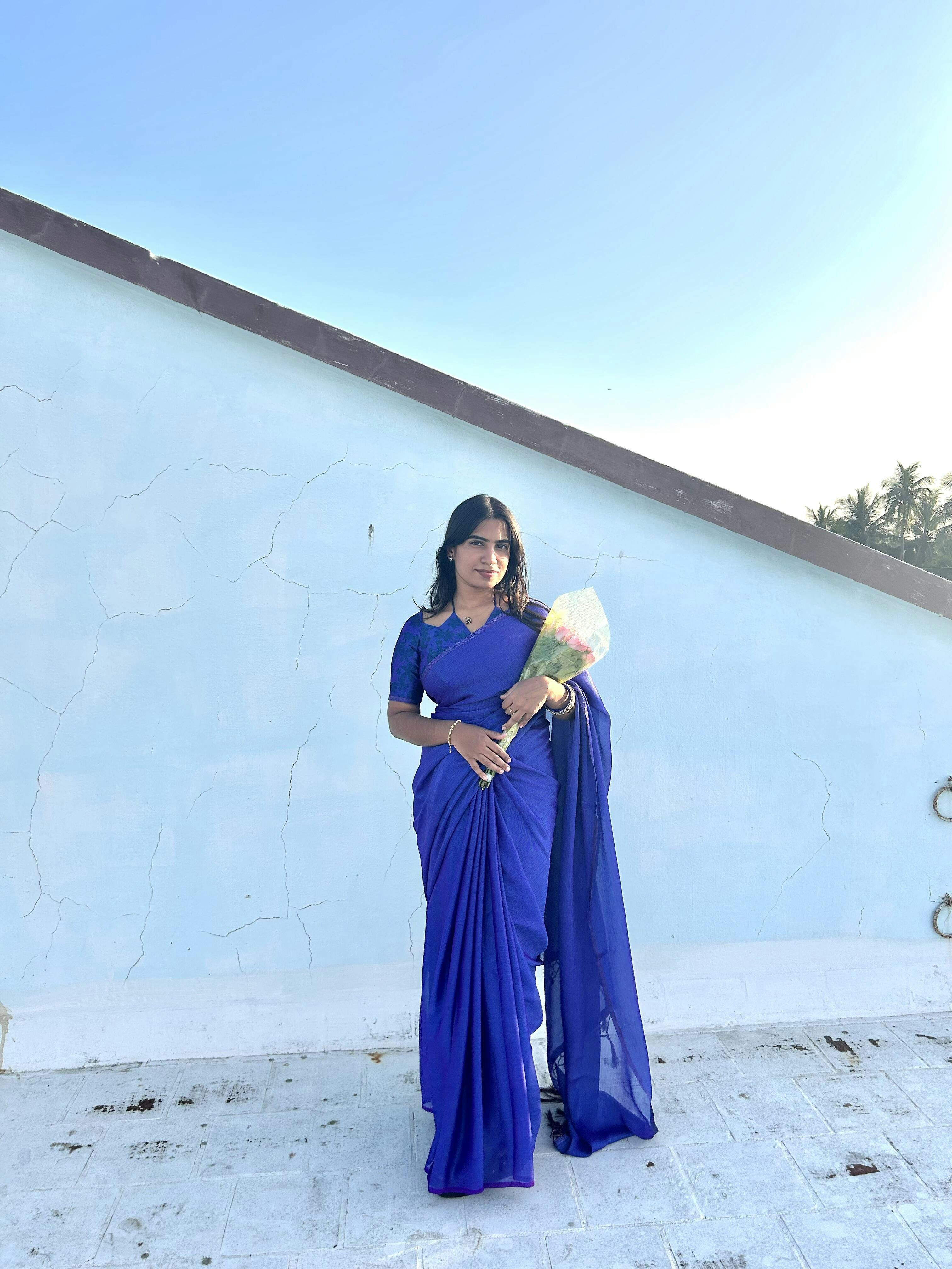 Borderless violet plain design viscose saree,flower motifs printed matching blouse