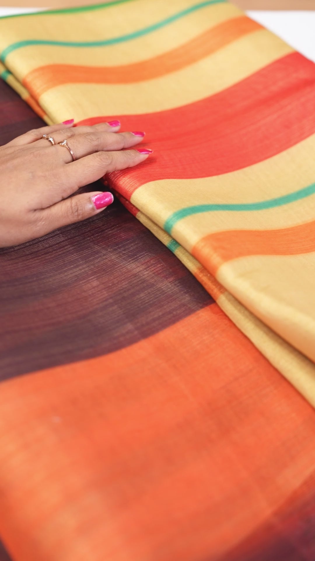 Brown horizontally striped linen cotton saree, contrast plain border, checks and striped pallu, and a horizontal striped blouse