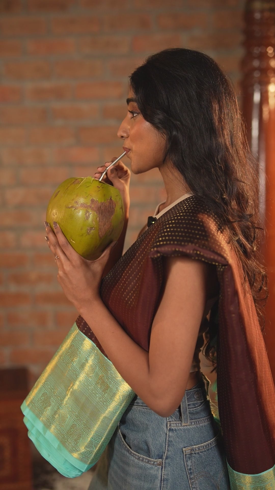 Brown Vasundhara Silk Saree Delicately Woven with Zari Buttas, Highlighted with a Contrast Border of Cross Kamalam, Mayil, Banaras, Yaanai, and Mayil Kann Designs, Pallu Grandly Woven with Jaal Designs, and Paired with a Contrast Blouse Vasundhara Pattu