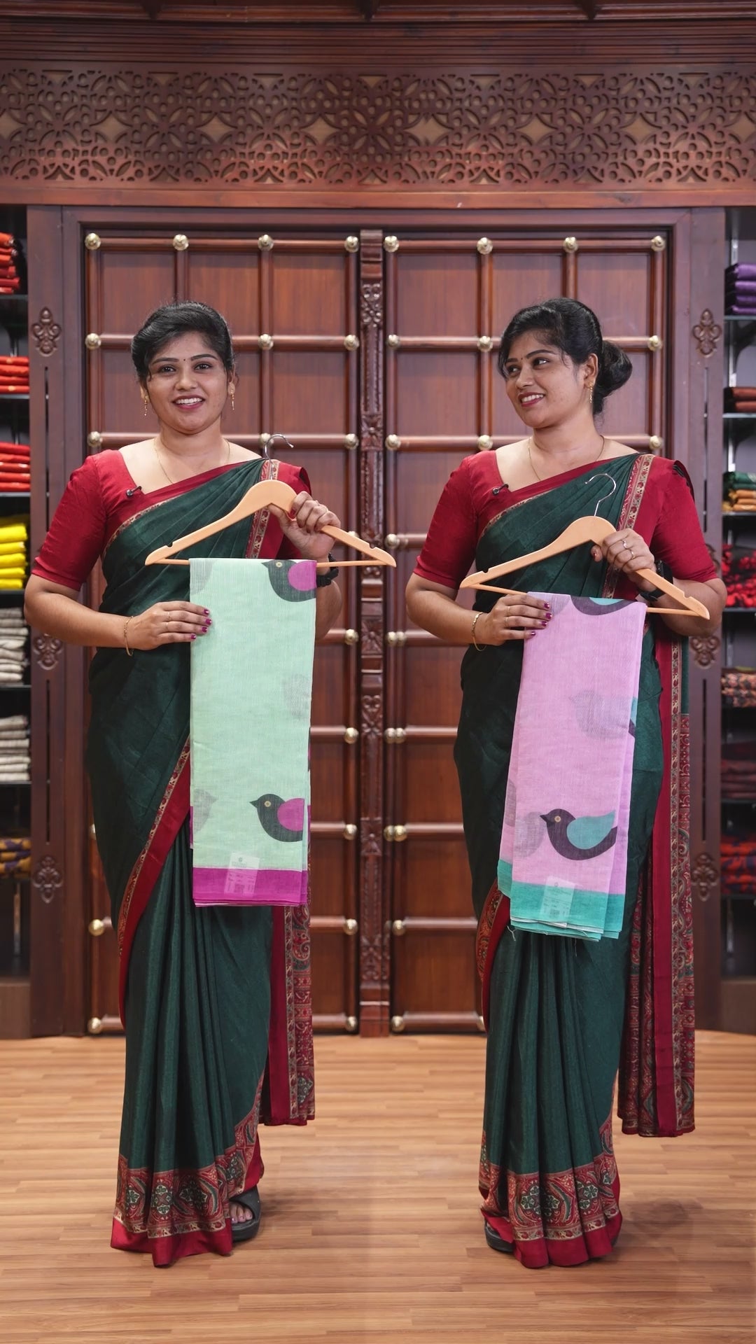 Chikku colur birds motifs linen cotton saree with contrast plain border , birds mofits pallu and leaf printed blouse