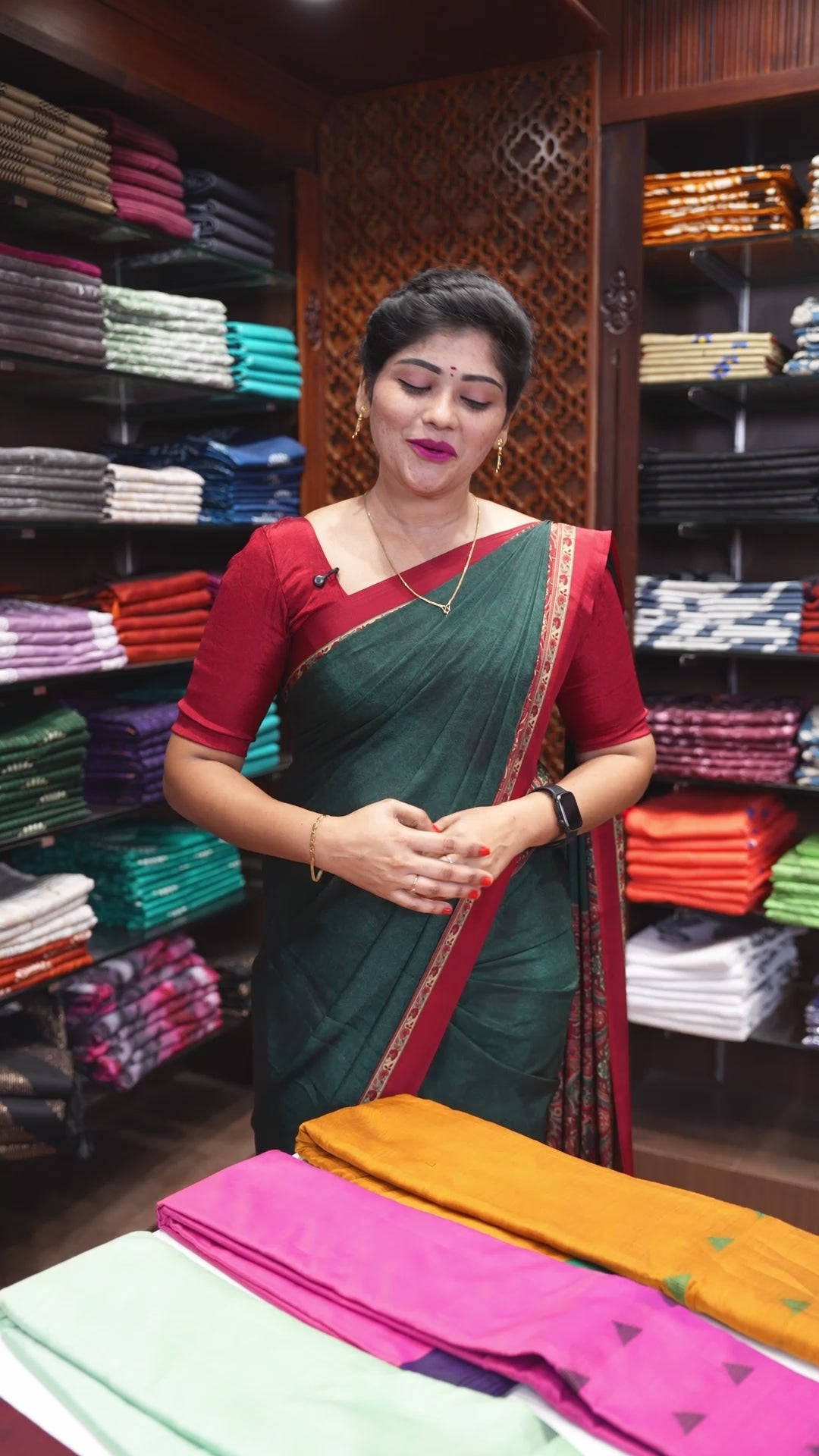 Chikku triangle motifs mercerised cotton saree, contrast plain border, striped pallu, and matching triangle motifs blouse
