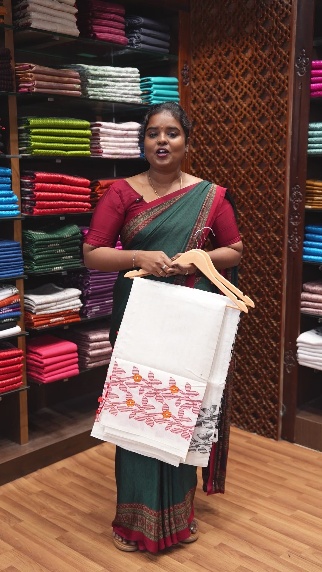Cream-black full-plain khadi cotton saree, double-sided floral vine printed border, floral printed border, and drop butta printed blouse