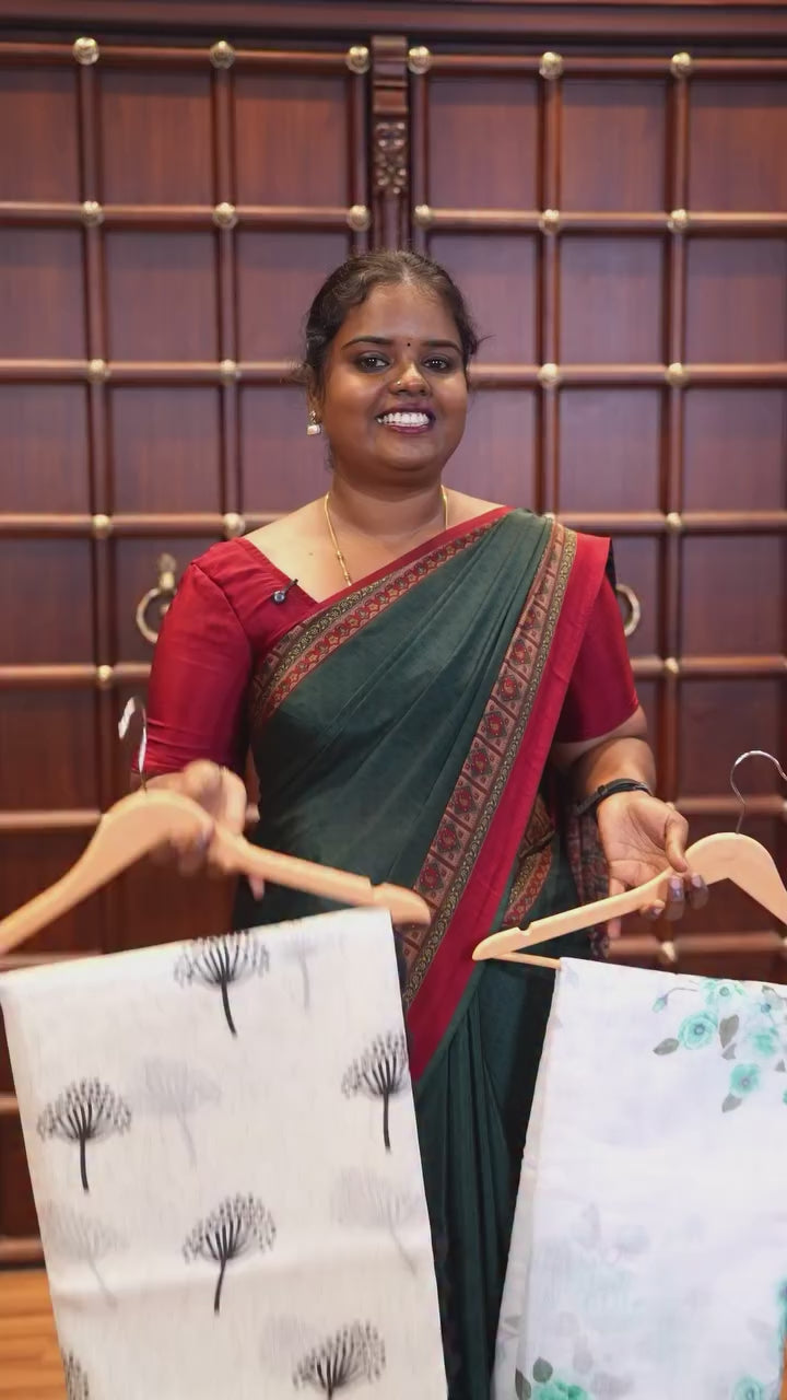 Cream floral-style printed khadi cotton saree, contrast green temple & lining printed border, lining printed border & printed blouse