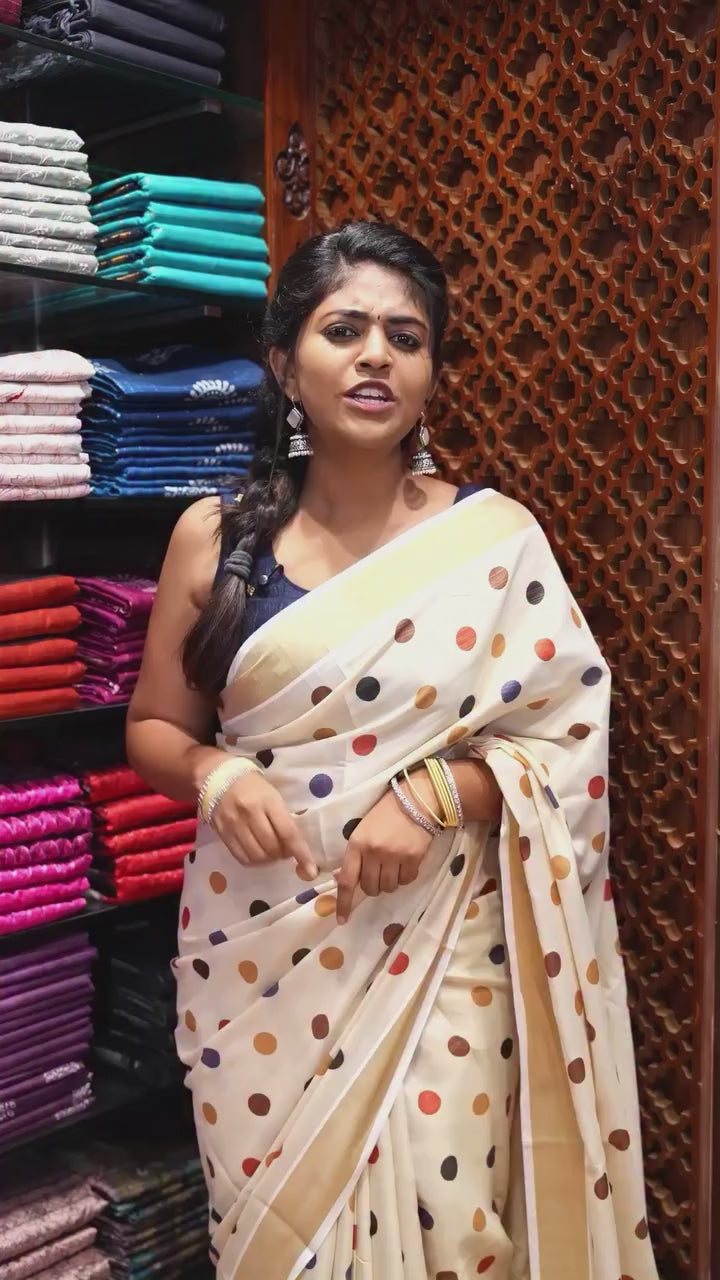 Cream multi-color polka dots printed Kerala tissue cotton saree, zari bavanji border, polka dots printed pallu, and small dots printed blouse