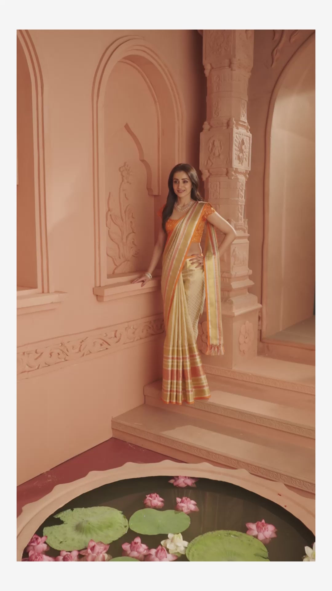 Gold meenakari zari buttas woven silk saree, contrast zari border of Banaras, poun & mayil kann design & zari woven grand pallu