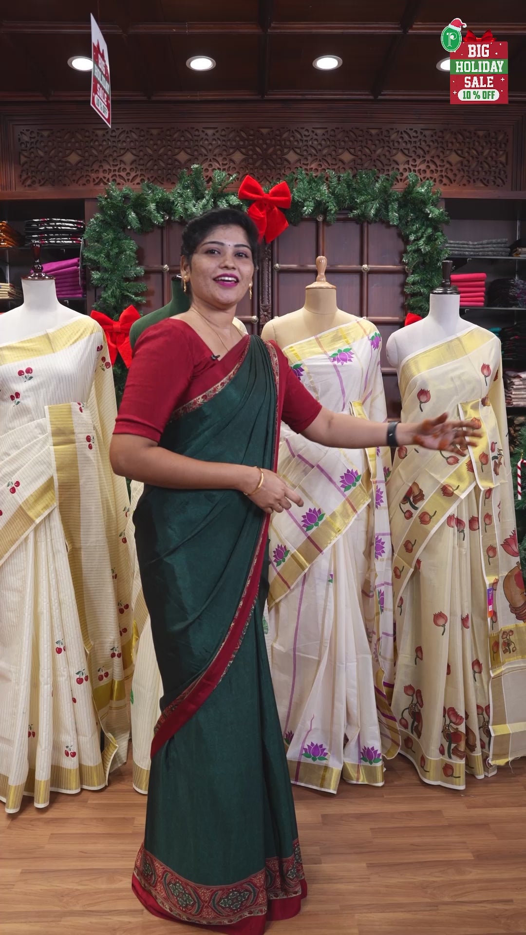 Gold-red pichwai lotus printed Kerala cotton saree, gold zari with lotus printed border, pallu features hand-holding lotus motifs, and lotus printed blouse