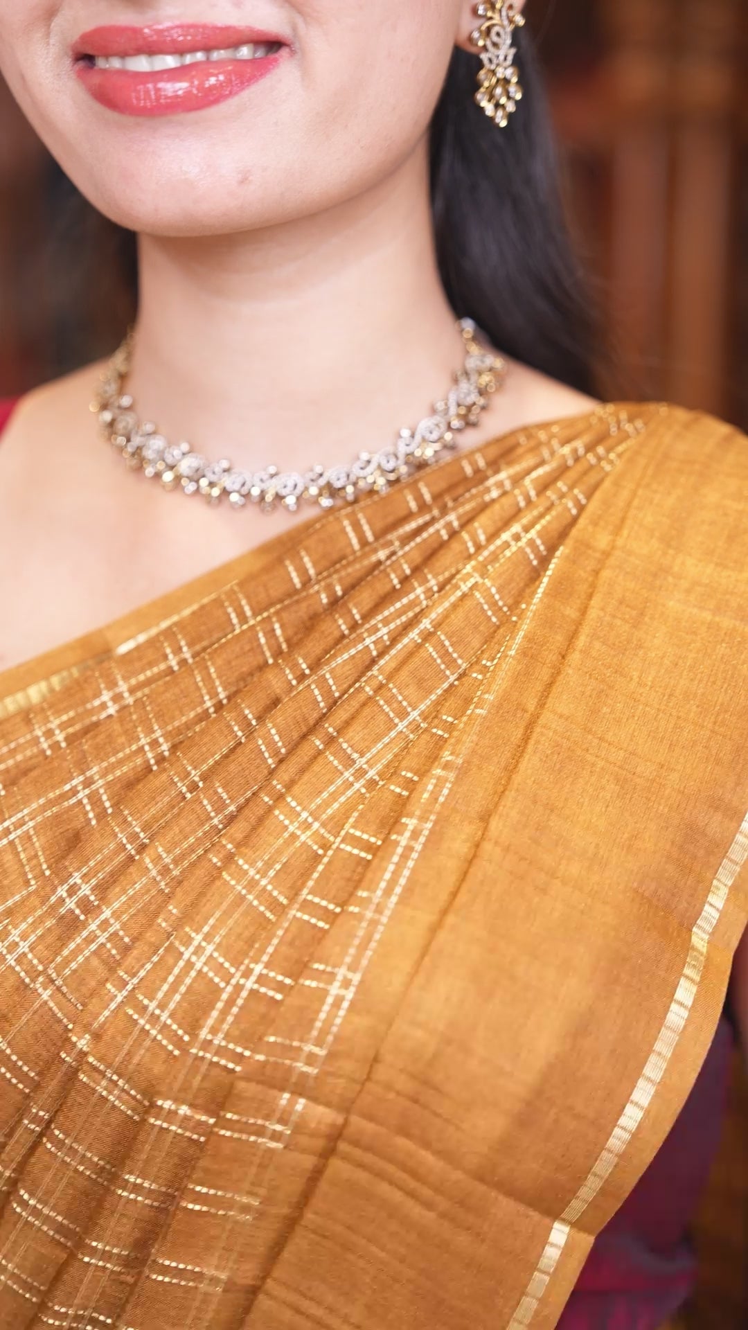 Golden brown zari checked fancy tussar silk saree, zari striped border, plain pallu, and a matching blouse