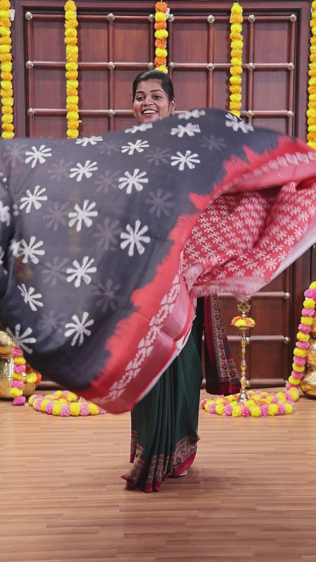 Green batik printed linen cotton saree, contrast printed and zari work border, batik printed pallu, and a contrast printed blouse