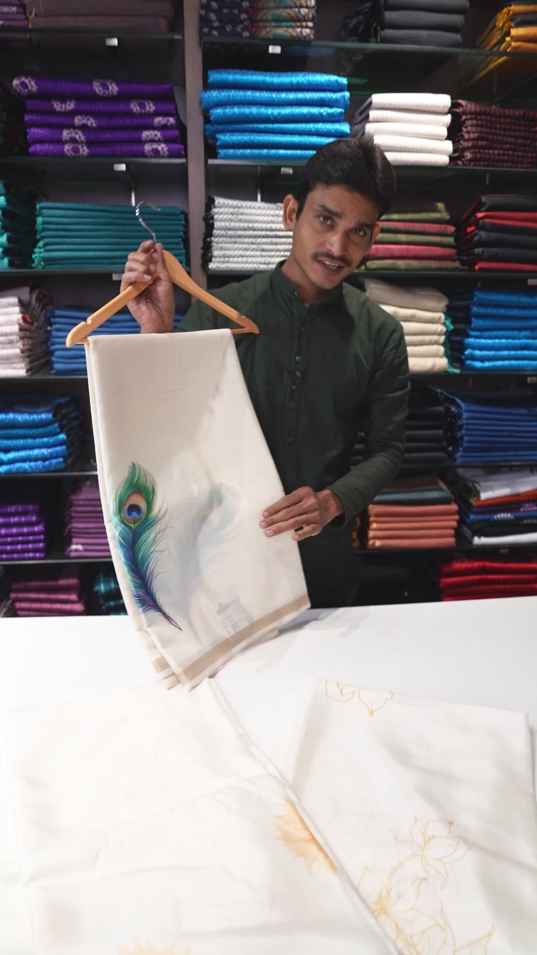 Half-white floral, and kathakali motifs digitally printed Kerala cotton saree, zari border, striped pallu, and matching blouse