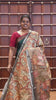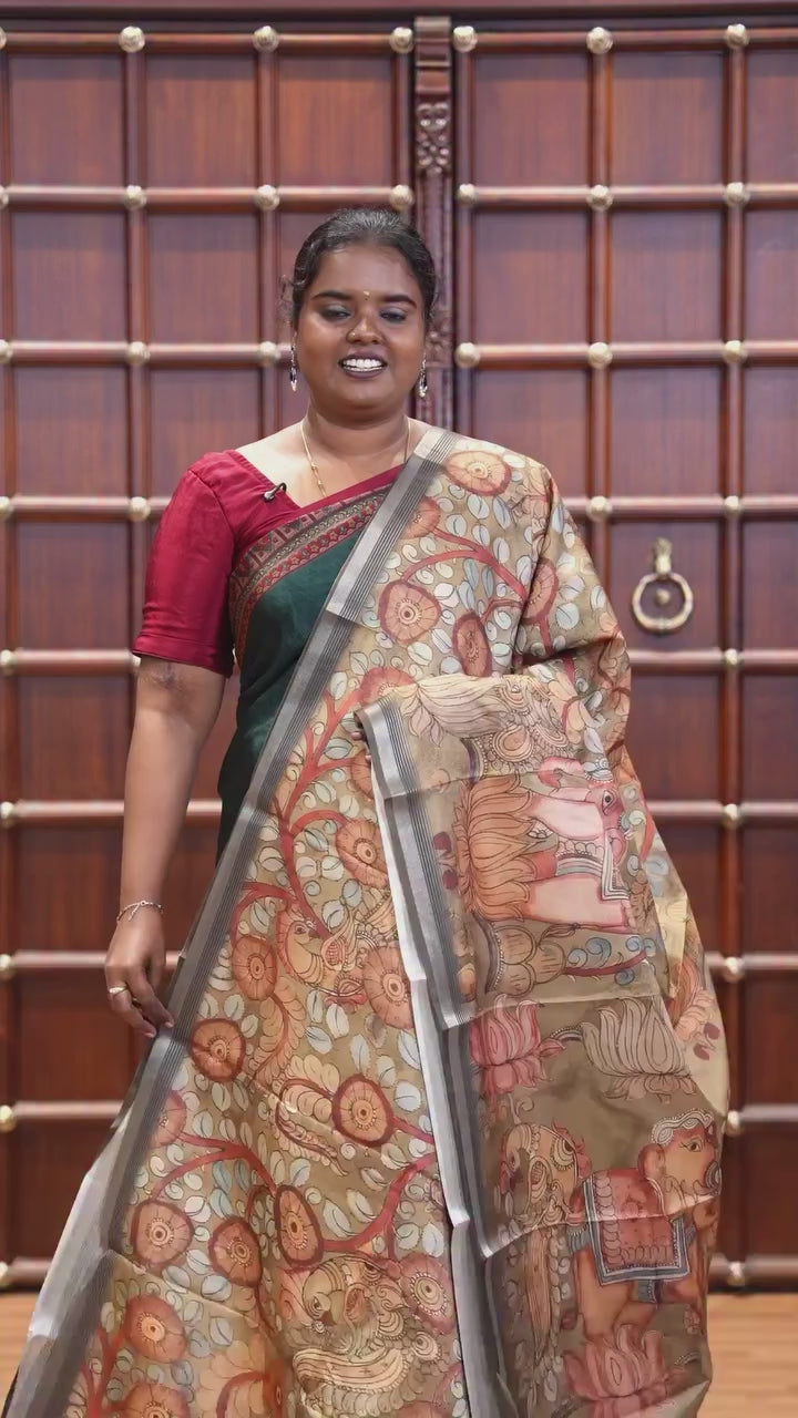 Light green kalamkari elephant, peacock, and floral printed semi-tussar saree, zari piping border, kalamkari motifs printed pallu, and contrast printed blouse