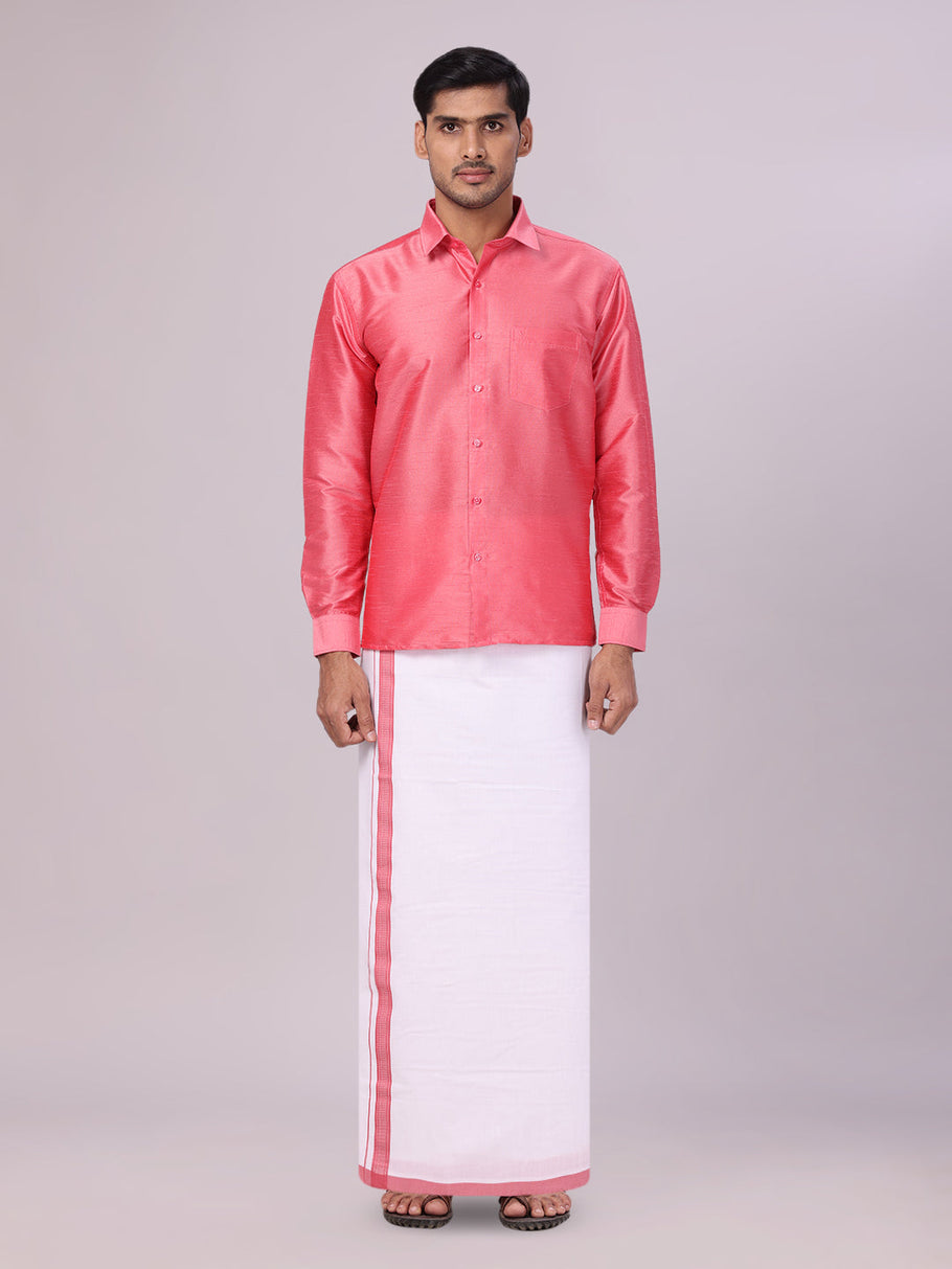 Mens Coral Pink Dupion Satin Shirt with Matching Border Dhoti Combo Gora