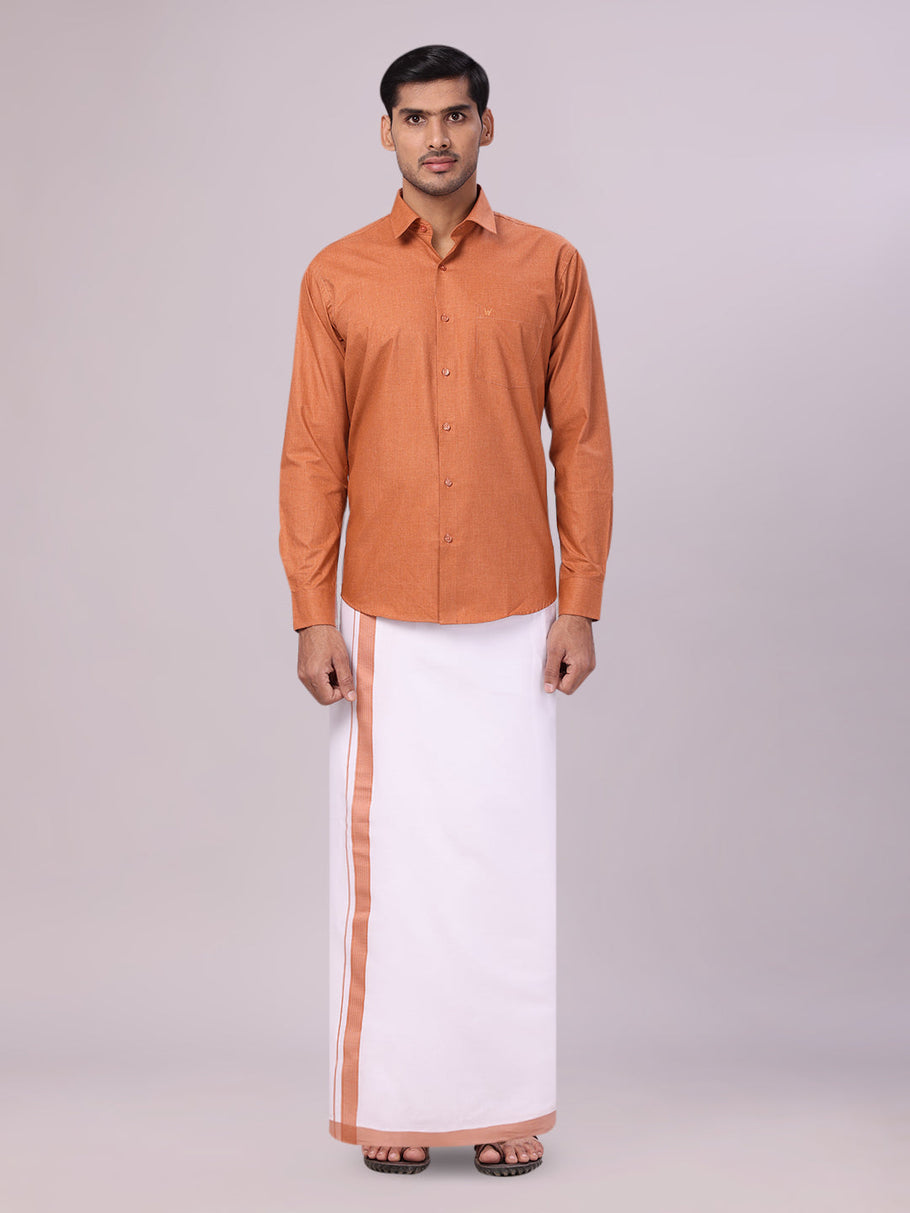 Mens Cotton Brown Shirt with Matching Border Flexi Dhoti Combo Casper Flexi