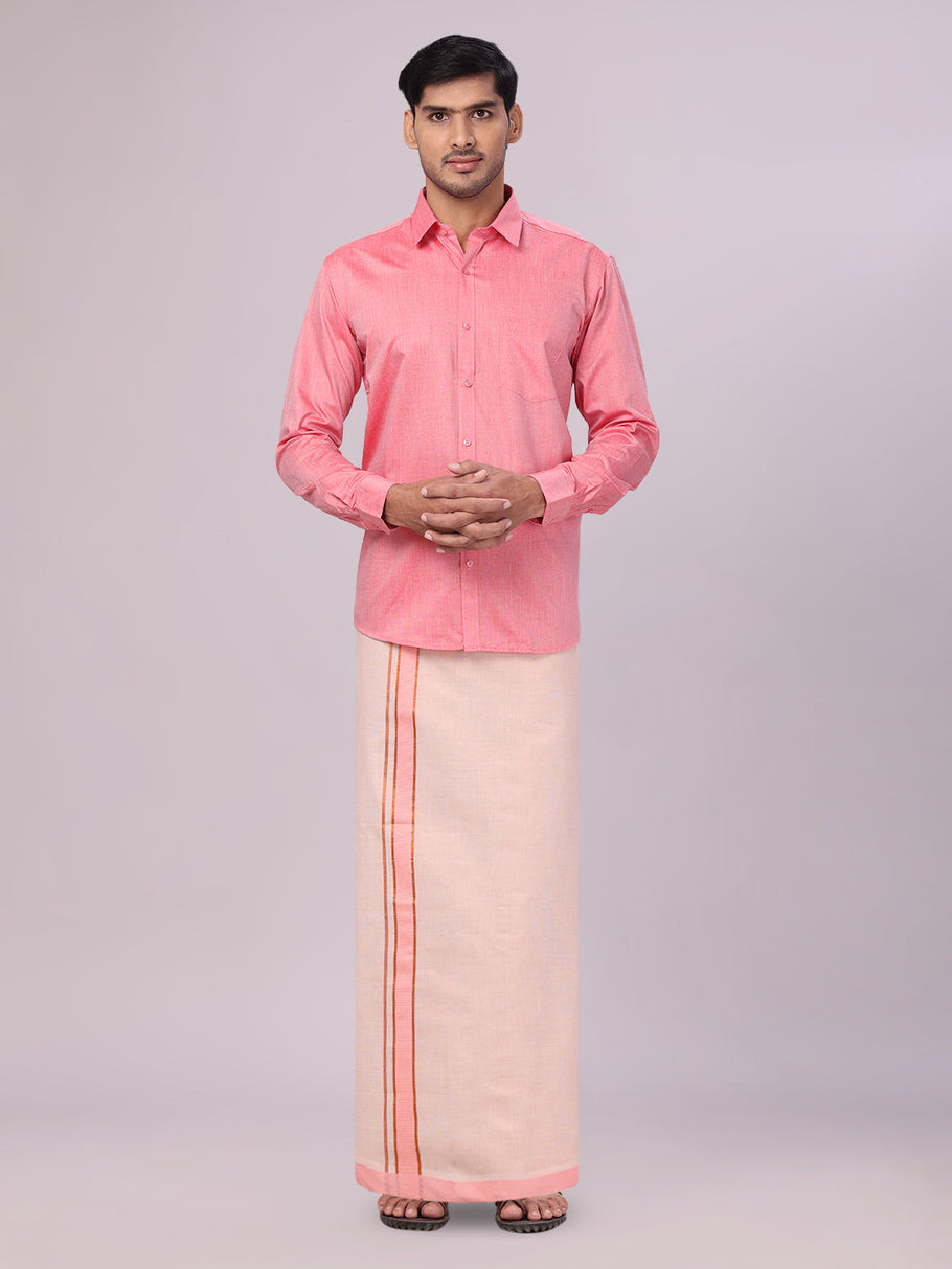 Mens Cotton Pink Shirt with Tissue Matching Border Dhoti Wedding Combo Kandala