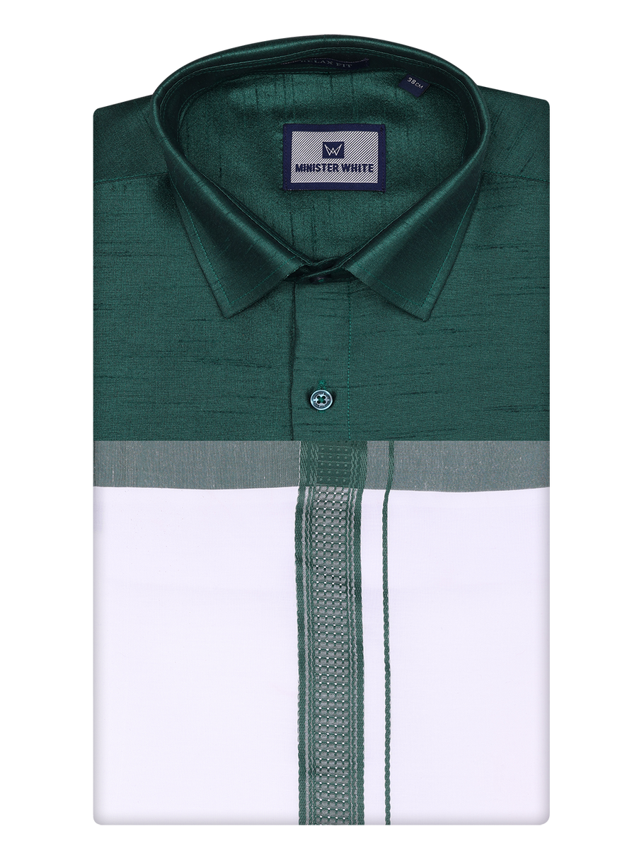 Mens Dark Green Dupion Satin Shirt with Matching Border Dhoti Combo Gora