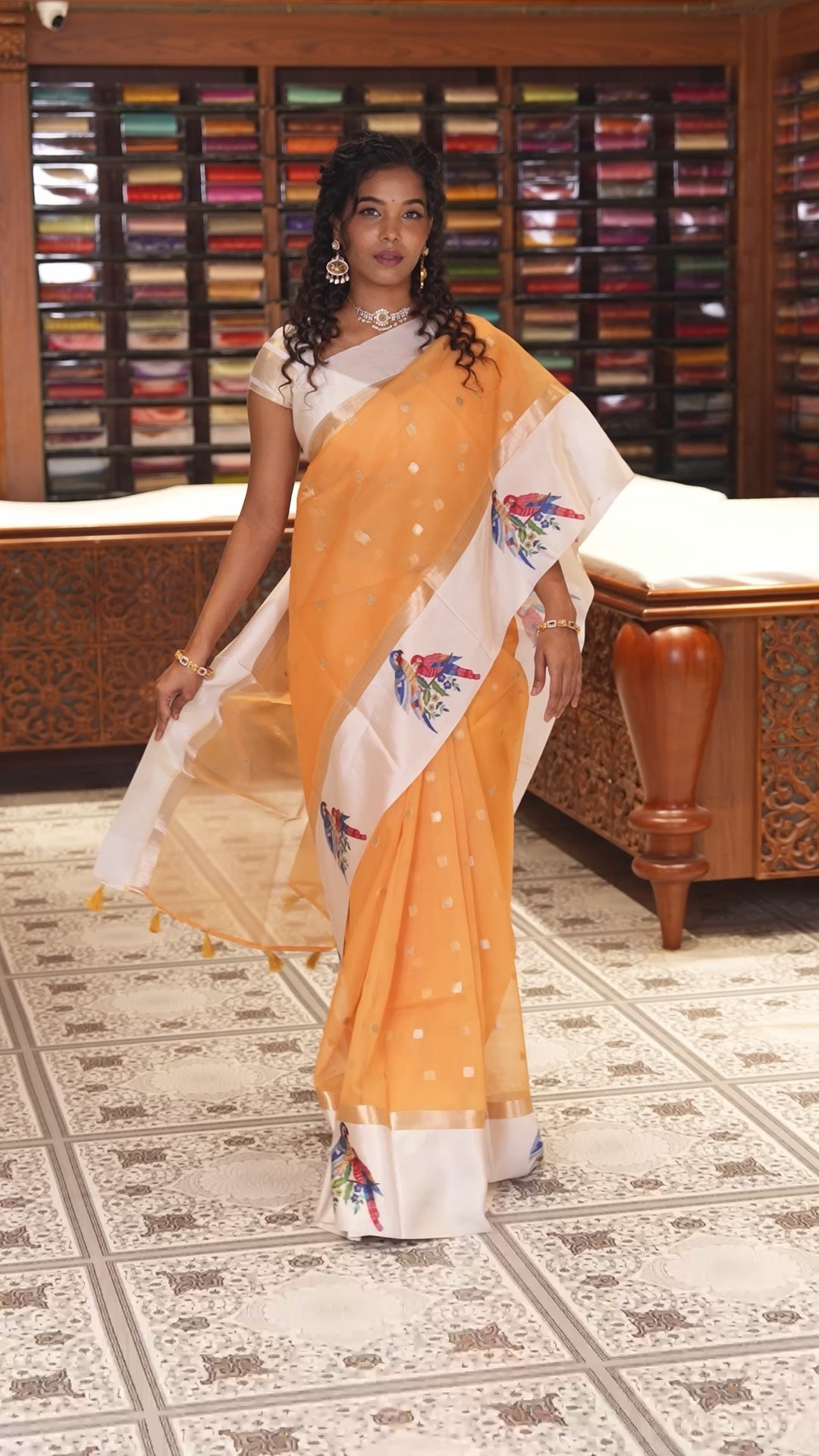 Mustard zari buttas fancy organza saree, contrast satin with small zari border of macaw parrot motifs digital print, zari pallu, and a running blouse