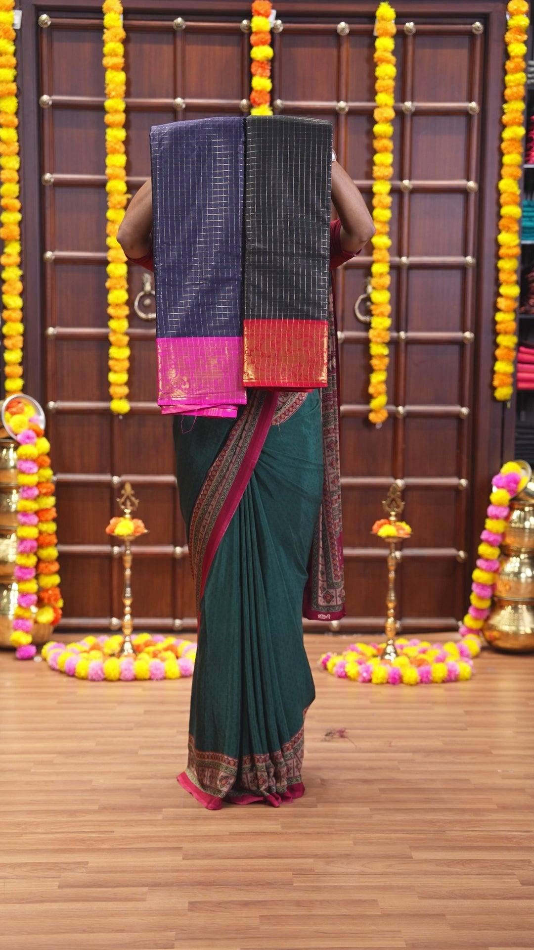 Navy blue golden zari checked semi-taffeta saree, contrast zari border of deer and peacock motifs, striped pallu, and a contrast zari design blouse