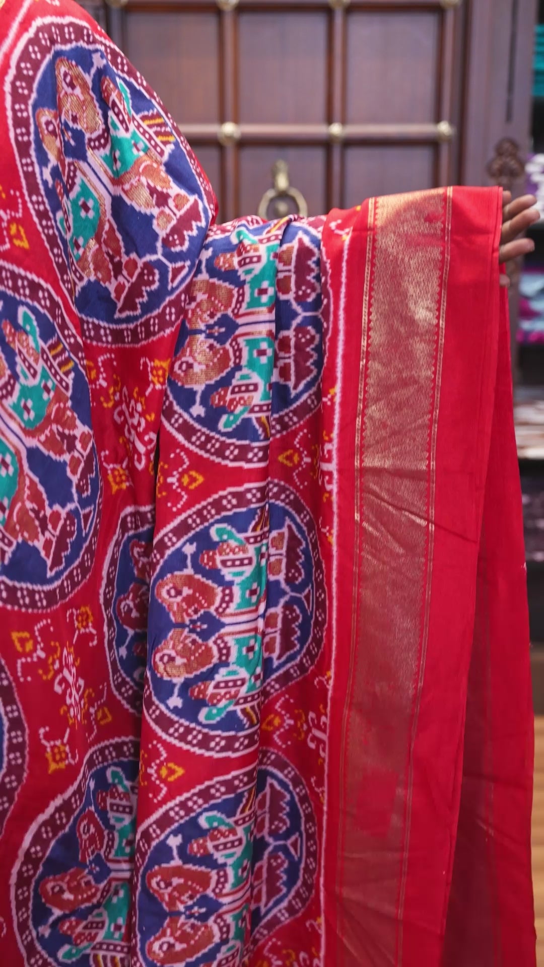 Orange pochampally style butterflies, and bird printed dola silk saree, contrast zari border, pallu of elephant palanquin, and contrast printed blouse