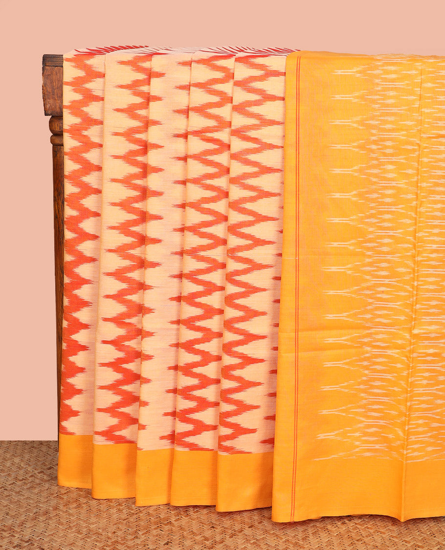 Pale Yellow Ikkat Cotton Saree, Vibrantly Detailed with Ikkat-Style Chevron Stripes All Over Its Body, Complemented by a Contrast Border, Pallu of Ogee Patterns in Ikkat Weave, and No Blouse Ikkat cotton