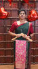 Pink lotus-leaf style printed semi-tussar saree, traditional zari border, zari striped pallu, and a matching blouse