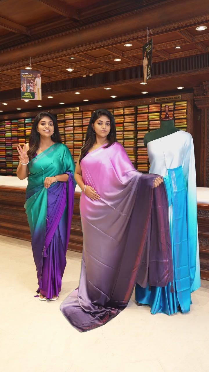 Pink ombre full-plain satin crepe saree, copper zari border, and plain blouse