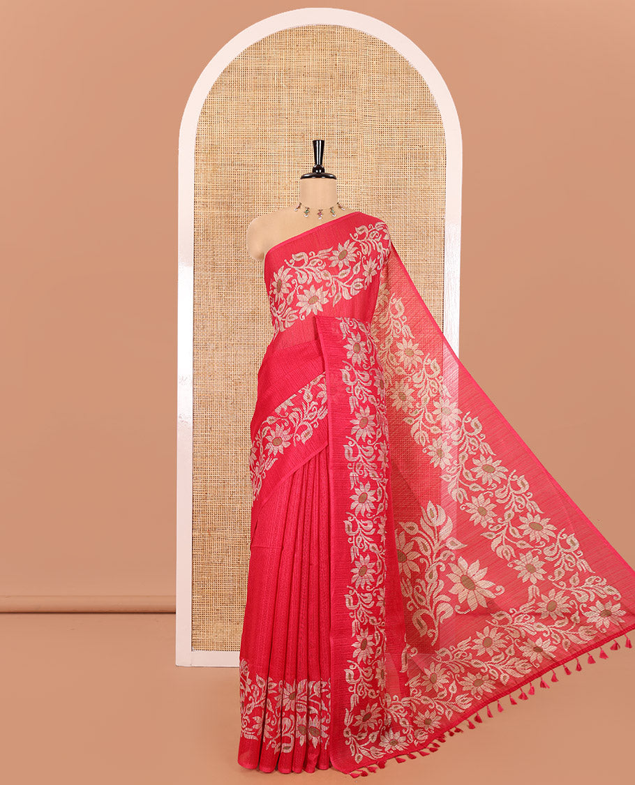 Pink Plain Green-Silk Linen Cotton Saree, Highlighted by Jamdani-Style Floral Vine Printed Border, Pallu of Jamdani Floral Print, and Paired with a Matching Printed Blouse Linen cotton
