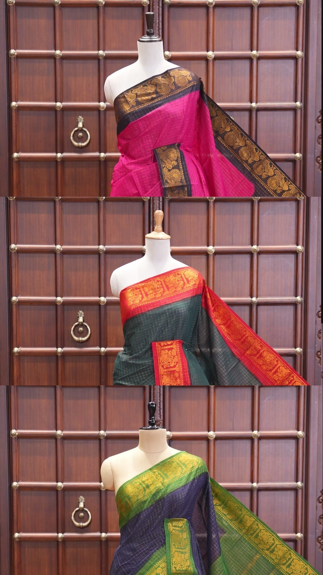 Rani pink checked sungudi cotton saree, contrast peacock motifs zari border, zari striped pallu, and a contrast zari design blouse
