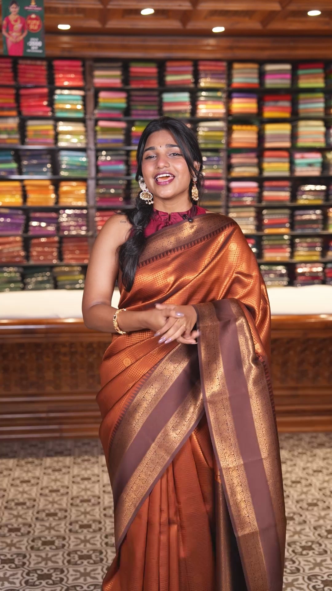 Rust orange-brown checked and peacock chakra zari buttas kanchi silk saree, contrast traditional zari rettai pettu border, jaal pallu, and a jacquard blouse