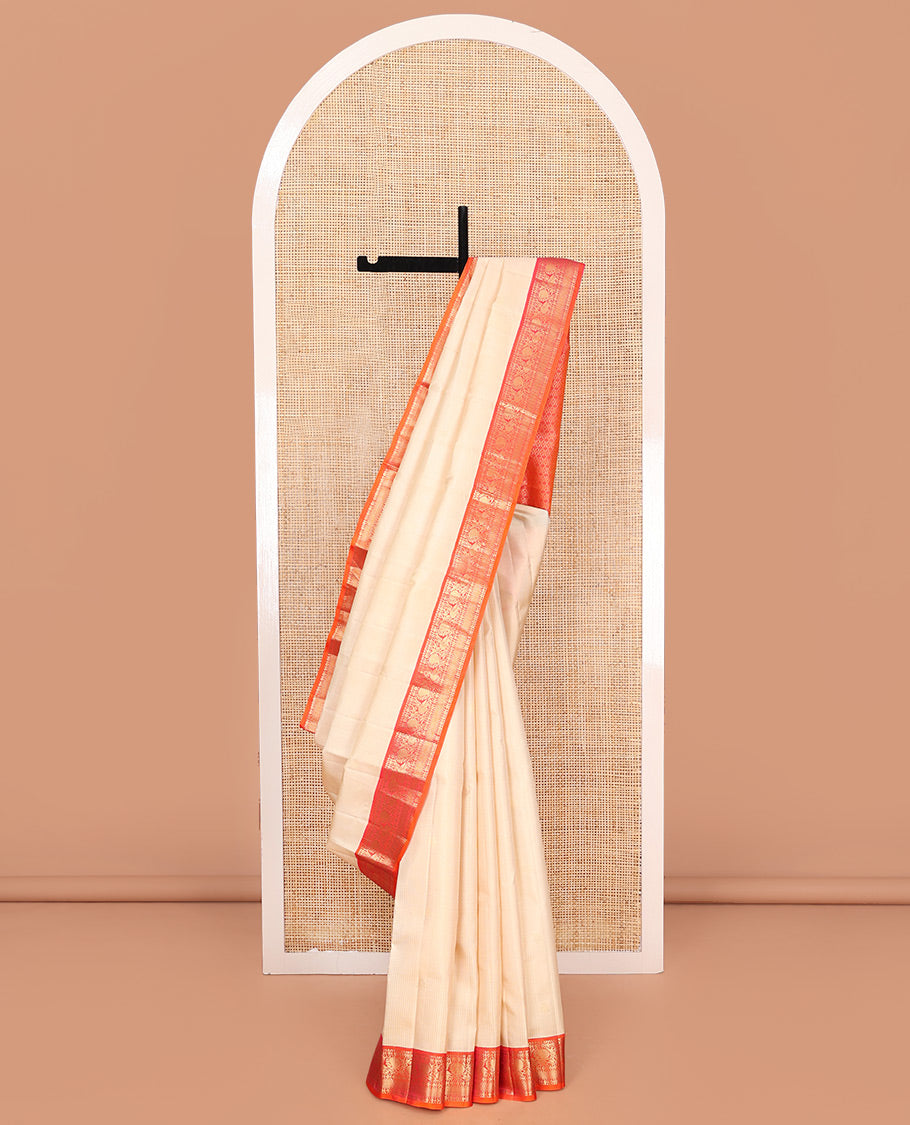 Sandal Vasundhara Silk Saree, Sparsely Woven with Zari Buttas on Its Body, Complemented by Contrast Border of Rudraksham, Mayil, Chakram, Muthu, and Mayil Kann Designs, Grandly Decked Up Pallu, and Paired with a Contrast Blouse Vasundhara Pattu