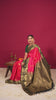 Tomato red zari buttas silk saree, contrast border of thilakam mokku, banaras, thilakam, and mayil designs, and zari-rich jaal design