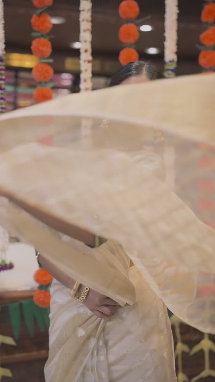 White semi-organza saree with zari buttas, zari border of temple & floral creeper designs, zari design pallu & running blouse